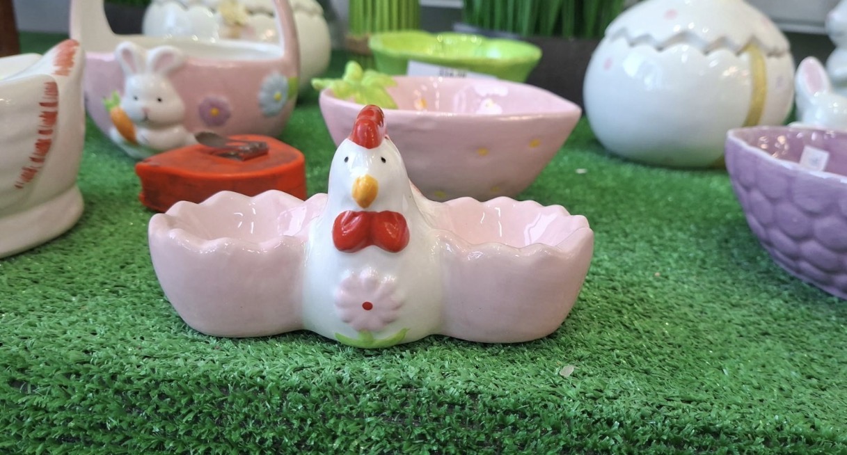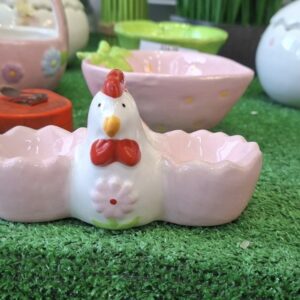 Realizată din ceramică de calitate, piesa are un design delicat: o găinușă centrală decorată cu detalii colorate și două suporturi laterale în formă de coajă de ou, într-o nuanță plăcută de roz. Această combinație oferă atât stabilitate pentru ouă, cât și un aspect decorativ care atrage privirile pe orice masă.